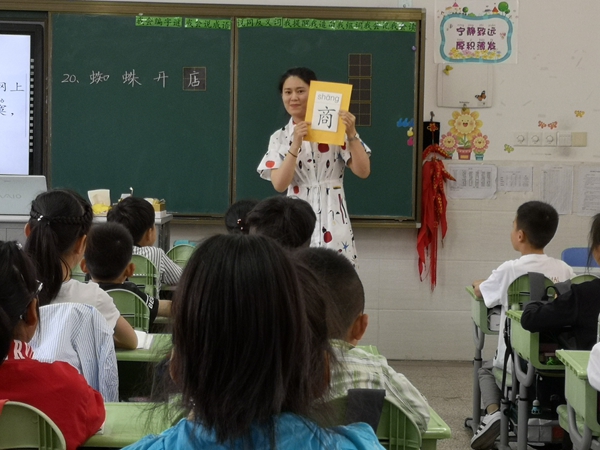 第二节课,二3班的陆心怡老师执教《蜘蛛开店》,重点落实低年级字词教学,运用字理,联系生活随文识字;从言语能力上,引导学生抓关键词,围绕“根据示意图讲故事”这一语文要素展开教学,三次运用示意图,引导学生把故事讲得生动、具体。整堂课板块清晰,层层推进,顺应学生的学习规律,明快清简的课堂深受孩子们的喜爱。