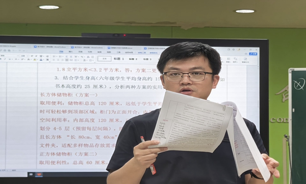 六年级陈妤婕老师通过两种储物柜的设计方案比较,助力学生巩固长正方体表面积计算方法,从单个储物柜到拼接储物柜的设计方案,发展抽象归纳和逻辑推理能力,建立“现实问题-数学问题”的转化意识。